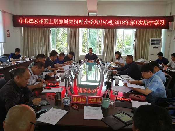 4月17日,中共德宏州国土资源局党组理论学习中心组在州国土资源局五楼会议室举行2018年第1次集中学习,会议组织学习党的十九大、十九届二中、三中全会、全国两会、中央经济工作会、十九届中央纪委二次全会、十届省纪委三次全会、州纪委七届三次全会精神,《习近平谈治国理政》第二卷以及国家安全法律法规等内容。