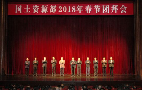 雄鸡唱罢九州乐,金犬吠来四海安。2月11日下午,地质礼堂灯光熠熠,暖意融融,国土资源部2018年春节团拜会在此举行。国土资源部在京部领导和部机关全体干部职工以及有关单位负责同志欢聚一堂,共迎新春。团拜会由国土资源部党组书记孙绍骋主持,国土资源部部长、国家土地总督察姜大明发表新春致辞,向全系统干部职工致以节日的问候和美好的祝愿。