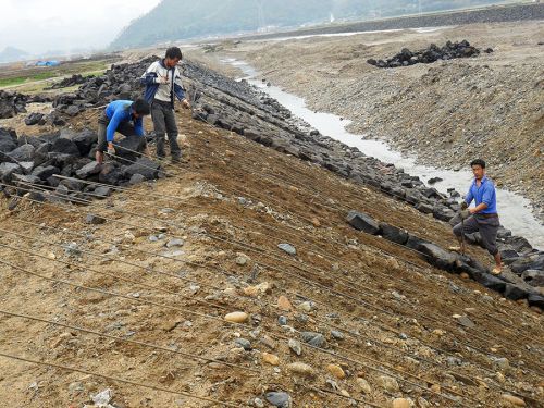铺筑钢筋串石建设农田防护与生态保护工程。
