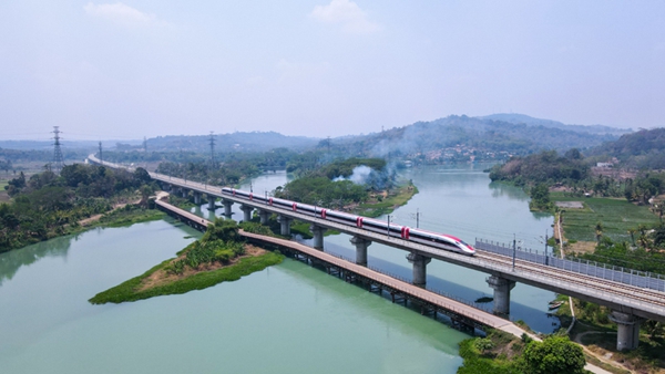 这是2023年9月30日在印度尼西亚普哇加达拍摄的一列行驶中的雅万高铁高速动车组(无人机照片)。新华社记者 徐钦 摄