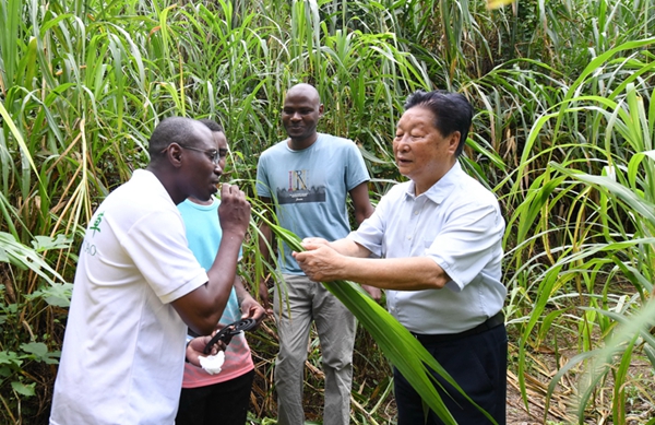 福建农林大学国家菌草工程技术研究中心首席科学家林占熺(右一)在福建农林大学菌草园让尼日利亚留学生试尝幼嫩菌草的味道(2021年8月12日摄)。新华社记者 林善传 摄