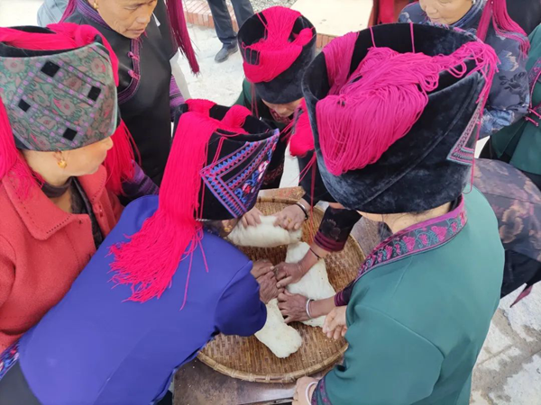 松东村哈尼族群众正在小广场上制作糯米粑粑,喜迎春节。