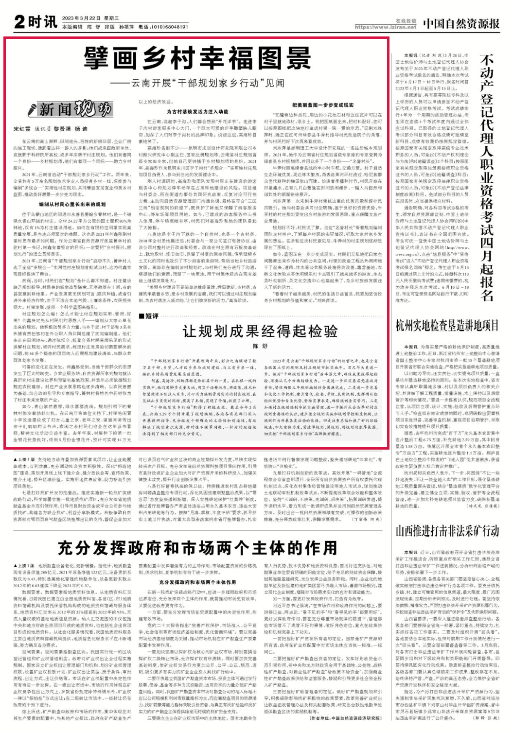 3月22日,《中国自然资源报》刊发文章《擘画乡村幸福图景——云南开展“干部规划家乡行动”见闻》。文章以昭通市永善县箐林村、昆明市东川区李子沟村、红河哈尼族彝族自治州绿春县牛弄村3名回乡干部参与“多规合一”实用性村庄规划编制的真实经历为切入点,多角度展示了我省5万余名规划技术专业人员投身乡村一线,共同擘画宜居宜业和美乡村蓝图,推动美好愿景一步步变为现实的良好精神风貌。