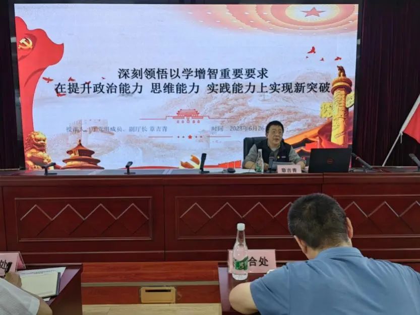 章吉青以“深刻领悟以学增智重要要求在提升政治能力思维能力实践能力上实现新突破”为题,围绕主题教育的根本任务、以学增智的丰富内涵和实践要求等方面进行详细讲授,对扎实开展主题教育,推动党建及党风廉政建设和业务工作再上新台阶提出工作要求。