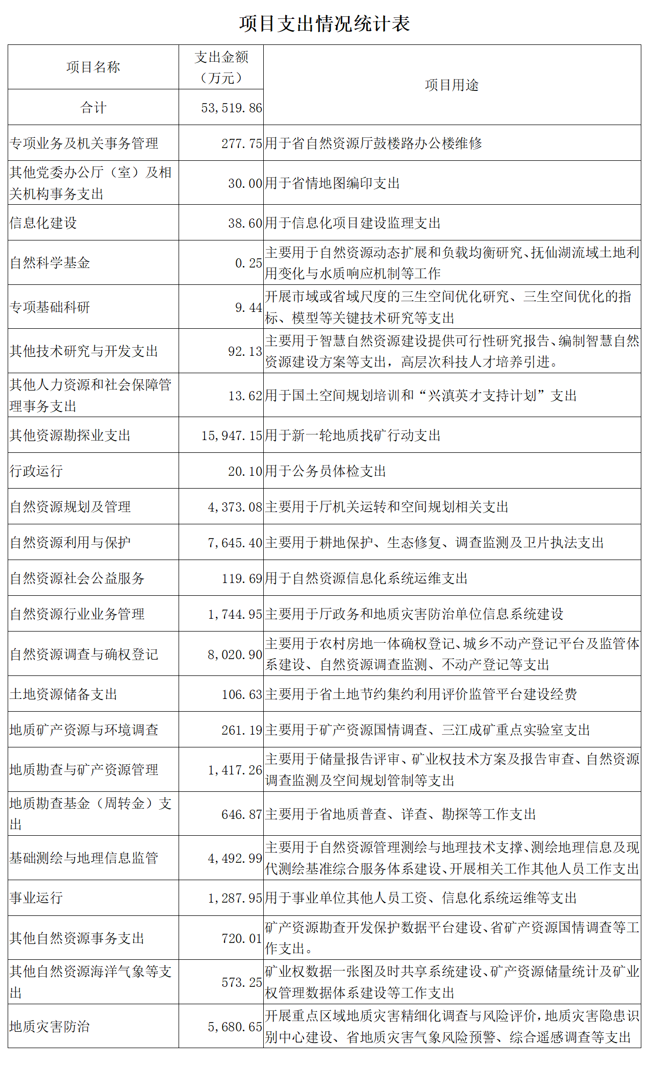 2023年度用于保障云南省自然资源厅机构、下属事业单位等机构为完成特定的行政工作任务或事业发展目标,用于专项业务工作的经费支出53519.85万元。其中:基本建设类项目支出0.00万元。具体项目开支及开展工作情况见项目支出统计表。