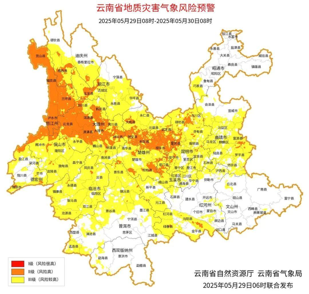 2025年5月29日8:00~5月30日8:00,昆明市西山区、东川区、安宁市、禄劝彝族苗族自治县、寻甸回族彝族自治县、富民县、嵩明县、宜良县,玉溪市红塔区、易门县、峨山彝族自治县、新平彝族傣族自治县,曲靖市会泽县、富源县、罗平县,楚雄彝族自治州楚雄市、禄丰市、武定县、元谋县、大姚县、姚安县、牟定县、南华县、双柏县,大理白族自治州大理市、剑川县、鹤庆县、洱源县、漾濞彝族自治县、云龙县、永平县、巍山彝族回族自治县、宾川县、祥云县、弥渡县、南涧彝族自治县,丽江市古城区、玉龙纳西族自治县、永胜县,迪庆藏族自治州香格里拉市、德钦县、维西傈僳族自治县,怒江傈僳族自治州泸水市、贡山独龙族怒族自治县、福贡县、兰坪白族普米族自治县,保山市隆阳区、腾冲市、龙陵县,德宏傣族景颇族自治州瑞丽市、盈江县、芒市,临沧市凤庆县、永德县,普洱市景东彝族自治县、镇沅彝族哈尼族拉祜族自治县,红河哈尼族彝族自治州元阳县、绿春县、金平苗族瑶族傣族自治县发生滑坡泥石流的风险高;昆明大部,玉溪市大部,昭通市南部,曲靖市大部,楚雄州大部,丽江市大部,迪庆州大部,怒江州大部,大理州大部,保山市大部,德宏州大部,临沧市大部,普洱市北部至东部、西部,红河州北部、西部至南部,文山壮族苗族自治州北部发生滑坡泥石流的风险较高。