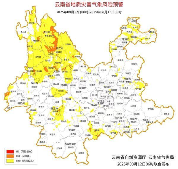 2025年8月12日8:00~8月13日8:00,昭通市镇雄县、大关县,楚雄彝族自治州大姚县,红河哈尼族彝族自治州绿春县,普洱市墨江哈尼族自治县、江城哈尼族彝族自治县,大理白族自治州大理市、鹤庆县、宾川县、弥渡县、漾濞彝族自治县、云龙县、洱源县,德宏傣族景颇族自治州盈江县,丽江市古城区、宁蒗彝族自治县、华坪县、永胜县、玉龙纳西族自治县,怒江傈僳族自治州泸水市,迪庆藏族自治州香格里拉市、德钦县、维西傈僳族自治县,临沧市临翔区、云县发生滑坡泥石流的风险高;昆明市东北部、南部,昭通市大部,曲靖市东北部至东南部、西部,玉溪市中部、西南部,保山市北部、南部,楚雄州北部,红河州南部,文山壮族苗族自治州南部,普洱市北部、南部,大理州大部,德宏州西北部、东部,丽江市大部,怒江州大部,迪庆州大部,临沧市东北部、西南部发生滑坡泥石流的风险较高。