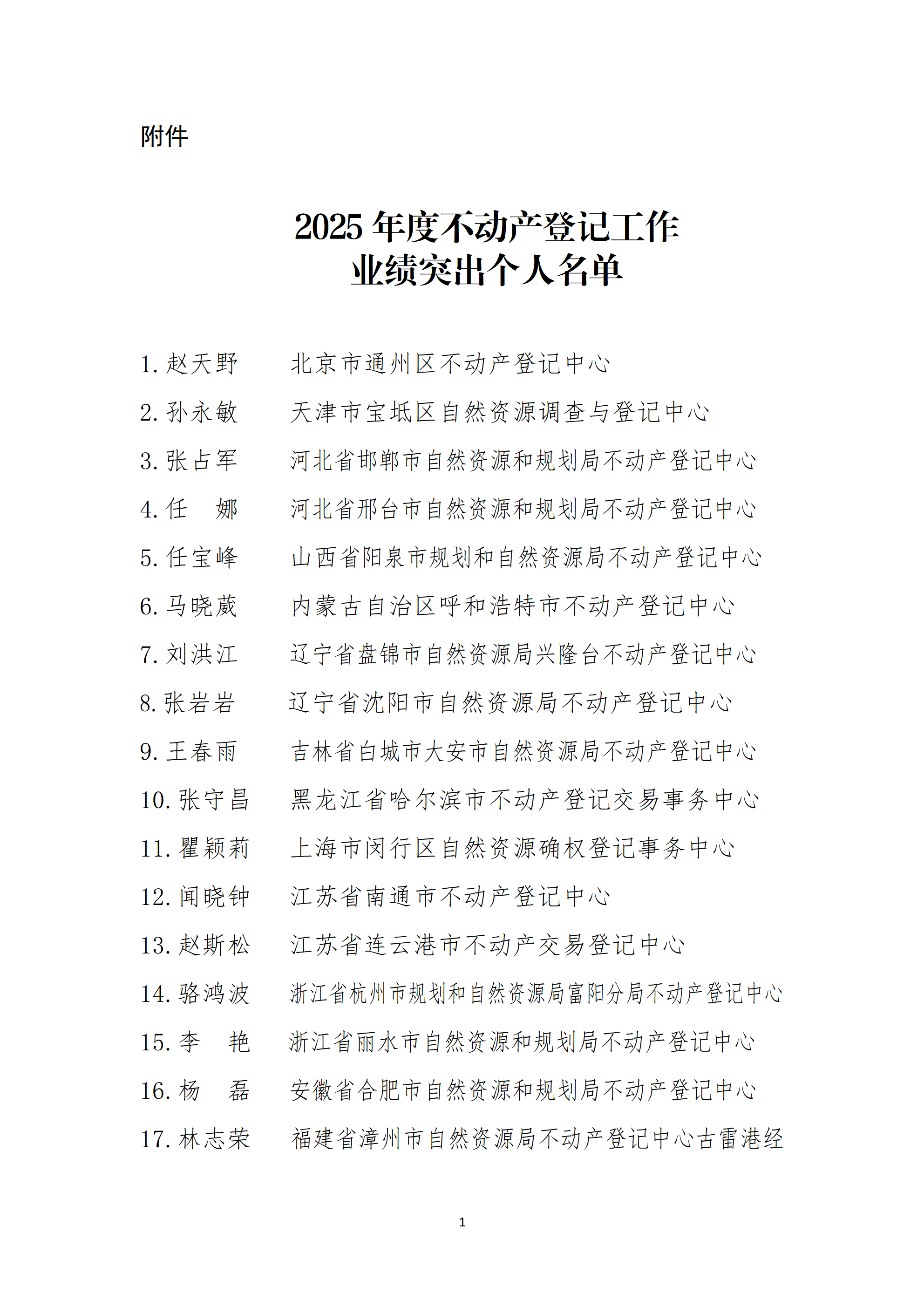 为进一步激励全国不动产登记工作人员更加奋发有为、担当作为,不断提升不动产登记便民利民服务水平,经研究,部决定对2025年度不动产登记工作业绩突出的赵天野等40名同志予以通报表扬。希望上述同志珍惜荣誉、再接再厉,发挥好示范引领作用,为企业和群众提供更加优质周到的不动产登记服务。各地不动产登记机构要进一步纵深推进队伍作风常态化建设,激励不动产登记工作人员积极向工作业绩突出个人学习,以优良作风提升工作水平,推动不动产登记事业不断取得新发展,维护好各类产权主体合法权益,服务好经济社会发展。