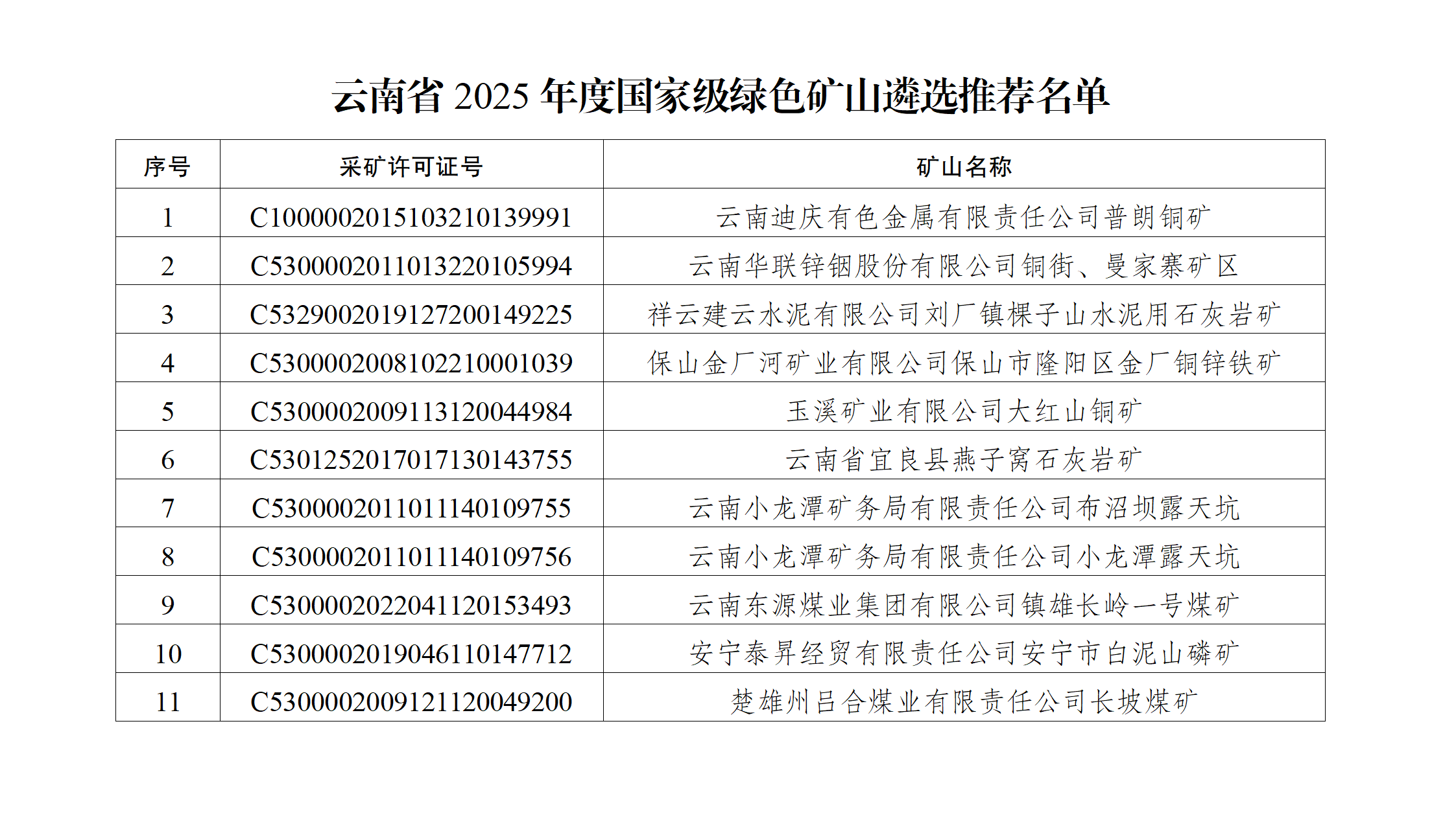 附件:云南省2025年度国家级绿色矿山遴选推荐名单