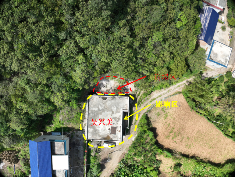 10月1日6时25分,该区域发生崩塌,落石方量约30立方米,造成吴兴美户房屋局部损毁,由于转移避险及时,未造成人员伤亡。