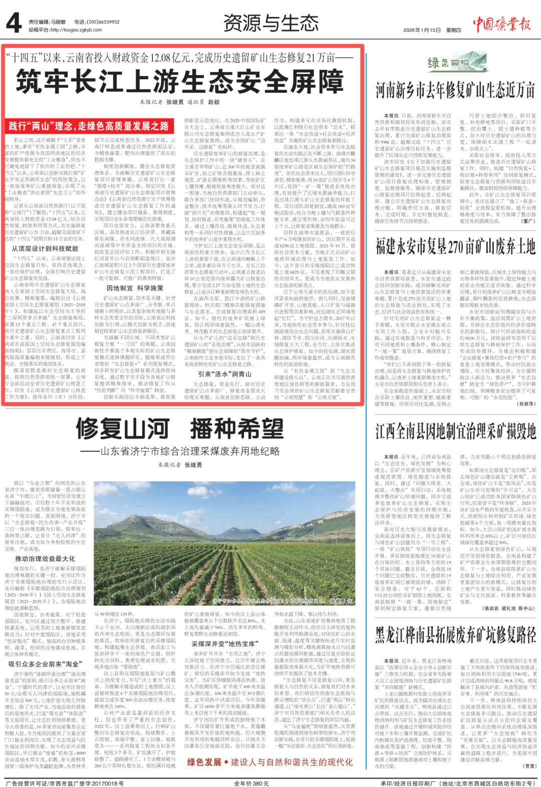 1月15日,《中国矿业报》刊文《“十四五”以来,云南省投入财政资金12.08亿元,完成历史遗留矿山生态修复21万亩——筑牢长江上游生态安全屏障》,聚焦“十四五”以来云南省投入财政资金12.08亿元,结合自然恢复、转型利用等方式共实施修复历史遗留矿山21万亩,超额完成国家下达的“十四五”预期目标15万亩的任务。