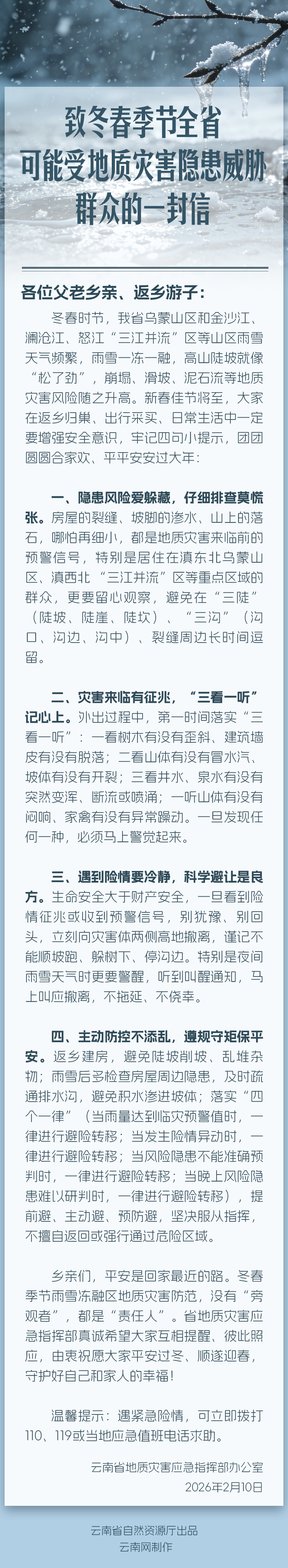 致冬春季节全省可能受地质灾害隐患威胁群众的一封信