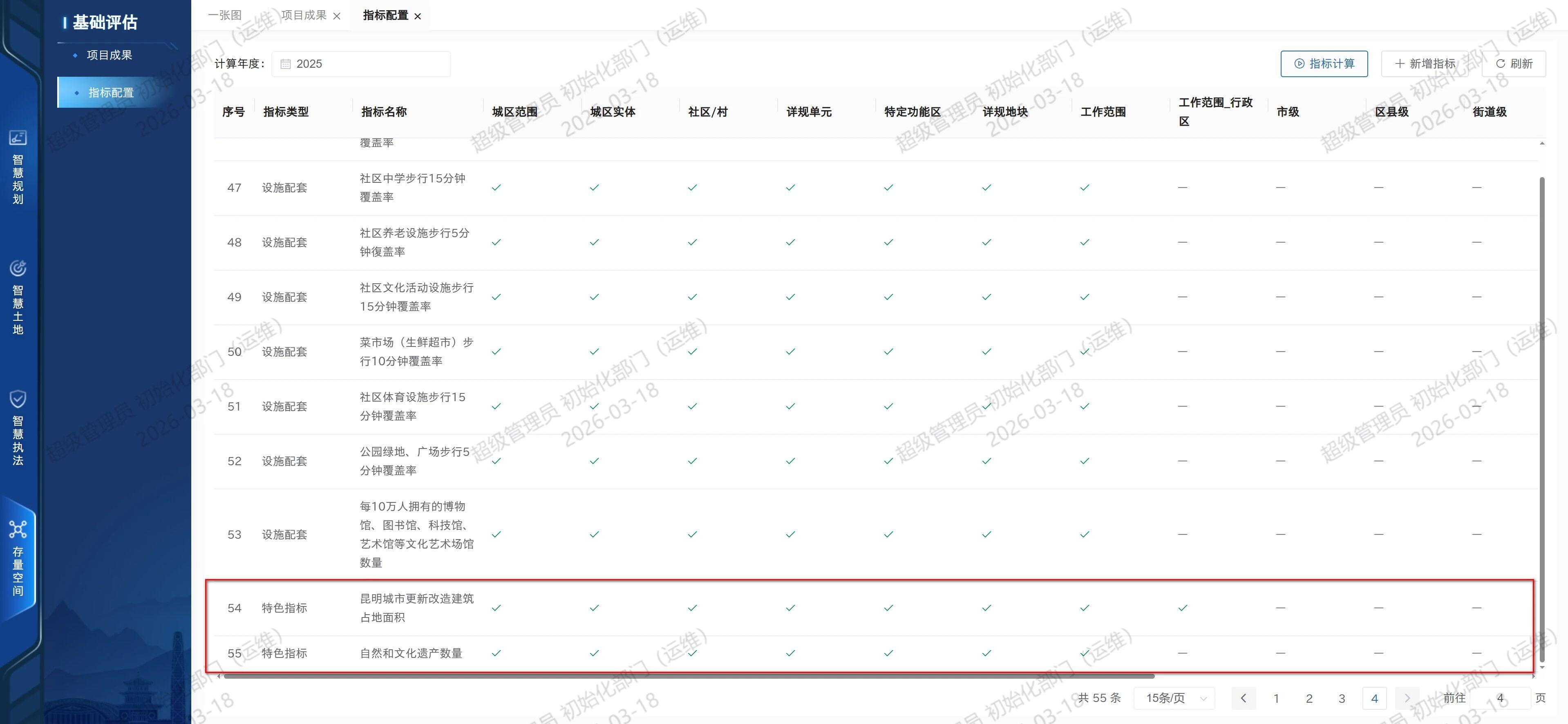 现状评估数据库:涵盖六大维度共54项国家设计指标和2项昆明特色指标(城市更新改造建筑占地面积、自然与文化遗产数量),形成多层级现状评估体系。
