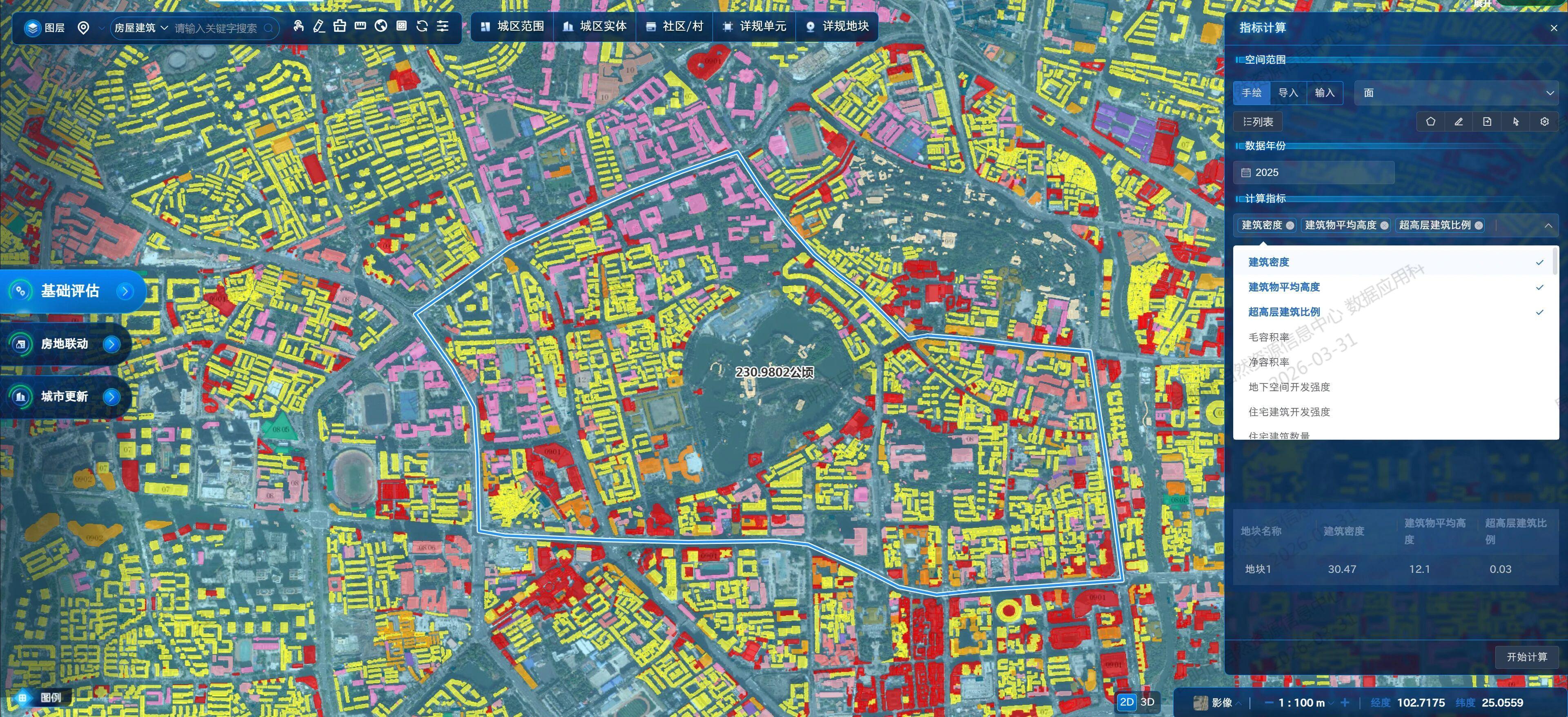 构建多维度城市更新开发综合评价体系,系统性地从区位价值、建筑质量、物理体量、商住功能适配性等方面进行综合评估,自动量化测算拆迁成本与潜在开发收益,精准识别建筑安全风险等级与更新价值等级,实现对城市更新单元的自动评估、分级诊断、智能排序与动态平衡测算。