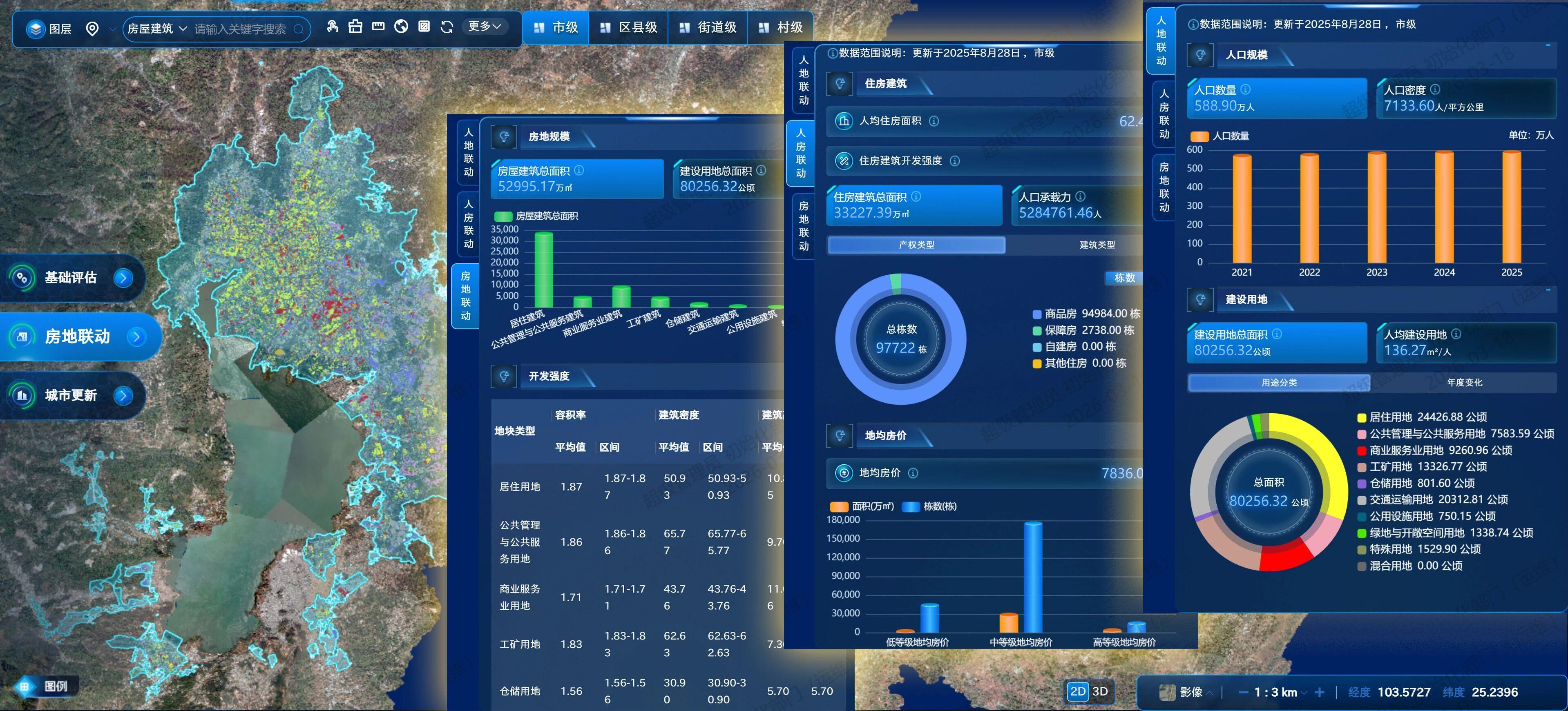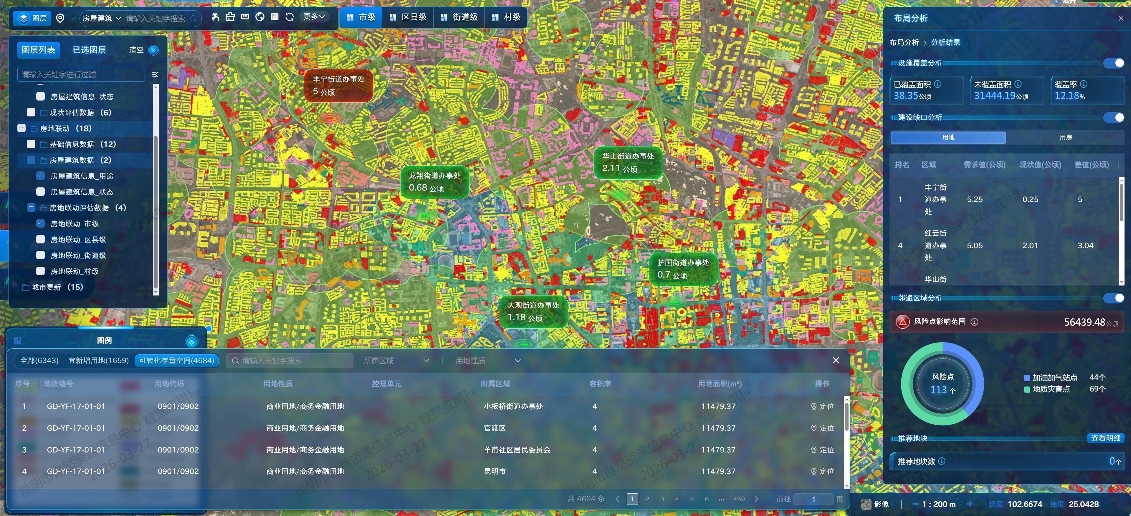 基础信息数据库:整合土地利用现状、土地权属、人口、房价、设施等数据,构建了包含13.63万余个要素的12大类基础数据图层。